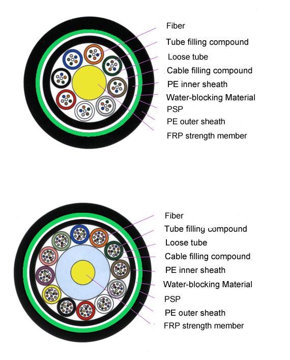The fibers, 250¦Ìm, are positioned in a loose tube made of a high modulus plastic. The tubes are filled with a water-resistant filling compound. A Fiber Reinforced Plastic (FRP) locates in the center of core as a non-metallic strength member. The tubes (and fillers) are stranded around the strength member into a compact and circular core. Then the cable core is covered with a thin polyethylene (PE) inner sheath, which is filled with jelly to protect it from water ingress. A layer of water-blocking material is applied around the cable core to prevent water ingress all the same. After a corrugated steel tape armor is applied. the cable is completed with a PE outer sheath.